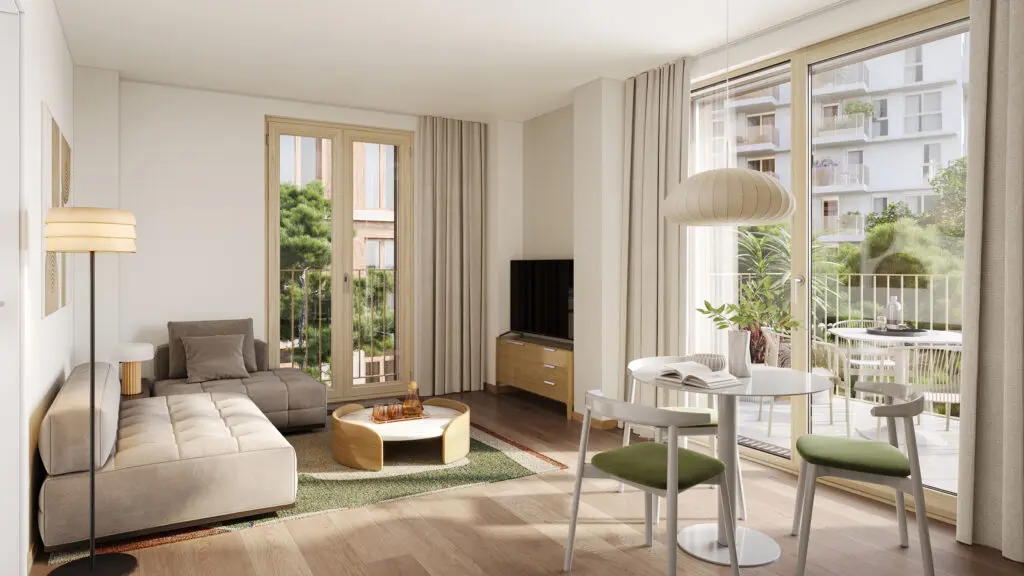 Die Wohnungen bieten dank bodentiefer Fenster sehr helle Wohnräume und mindestens einen Balkon. © Visualisierung: Squarebytes
