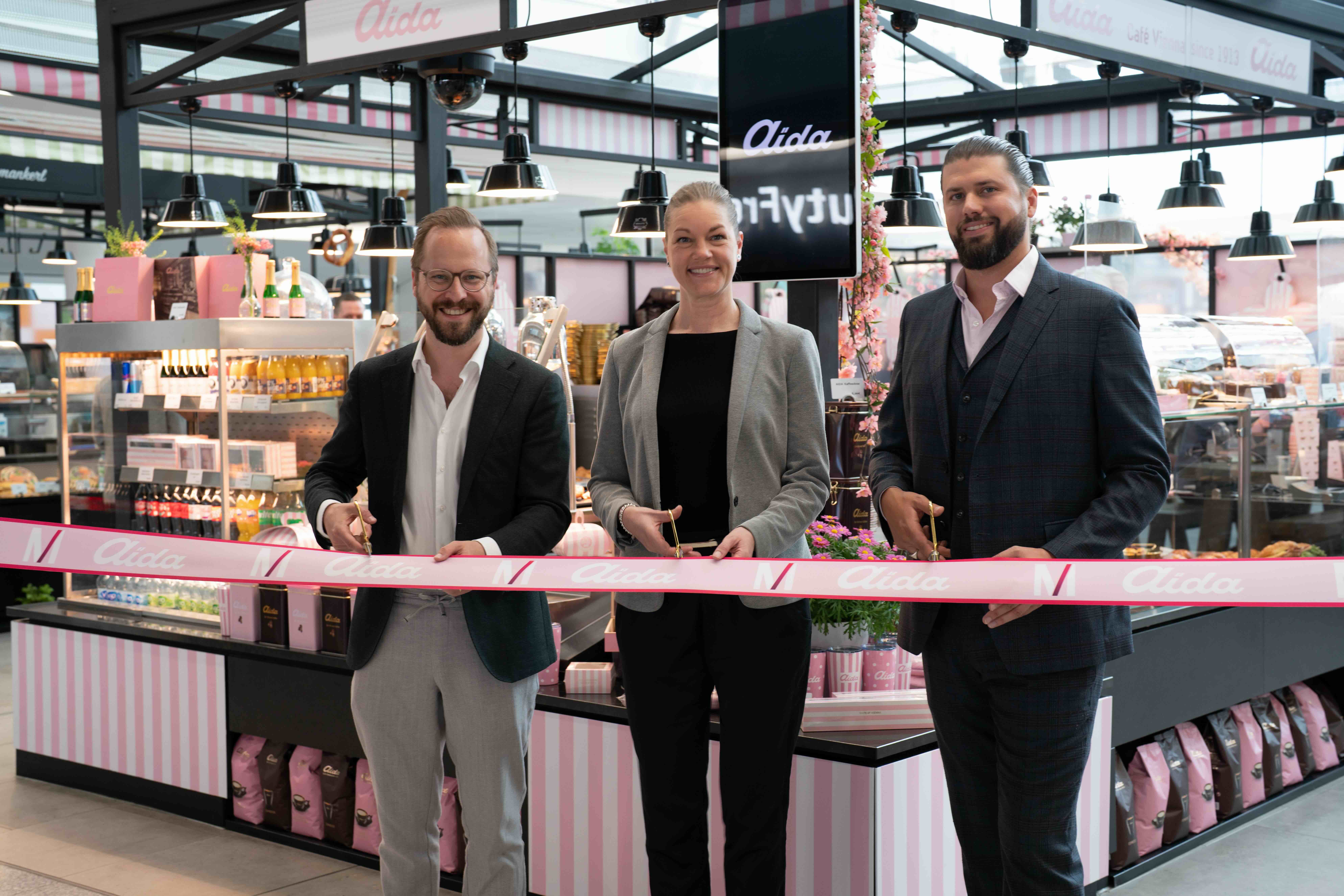 Eröffnung der AÏDA-Filiale am Flughafen München. V.l.n.r.: Andreas Reichert (Geschäftsführer Allresto), Maria Dahlhaus (Senior Vice President Commercial Activities Flughafen München), Dominik Prousek (vierte Generation der AÏDA-Eigentümerfamilie). – ©Allresto