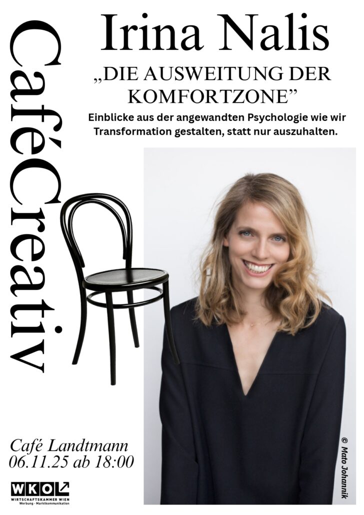 In der Reihe „Café Creativ“ der Fachgruppe Werbung und Marktkommunikation Wien wird am 6. November die Transformationspsychologin Irina Nalis zu Gast sein. Die Transformationspsychologie sucht nach Möglichkeiten, psychologische Erkenntnisse über menschliche Motivation und Potenziale für Gestaltung von Veränderung einzubringen.