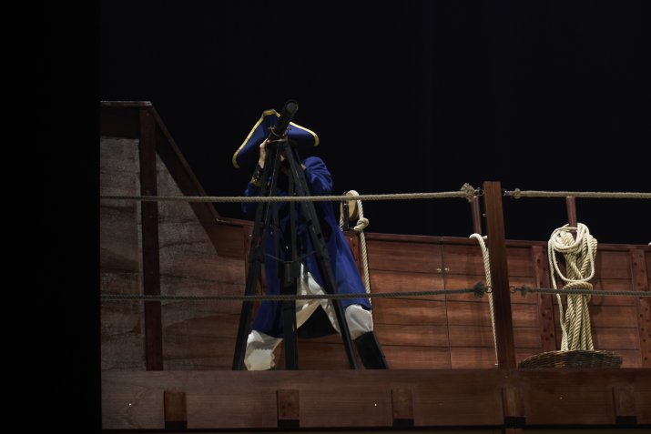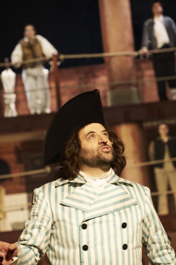 Drei Decks, ein riesiger Schiffsquerschnitt, mehr als 30 Matrosen, die sich durch die Szenerie wuchten. Bühnenbildner Maximilian Lindner lässt hier keine halben Sachen gelten. Es ist ein gewaltiges Bild, das Staunen erzeugt – und gleichzeitig irritiert. Denn die verbindenden Passagen, die als dramaturgisches Scharnier zwischen den vier Episoden dienen sollen, stehen in keinem Verhältnis zu dieser visuellen Überwältigung. Sie sind für den Fortgang der Handlung kaum von Belang, und das groß angelegte maritime Spektakel wirkt wie ein Aufwand, der nicht der erzählerischen Notwendigkeit entspricht.