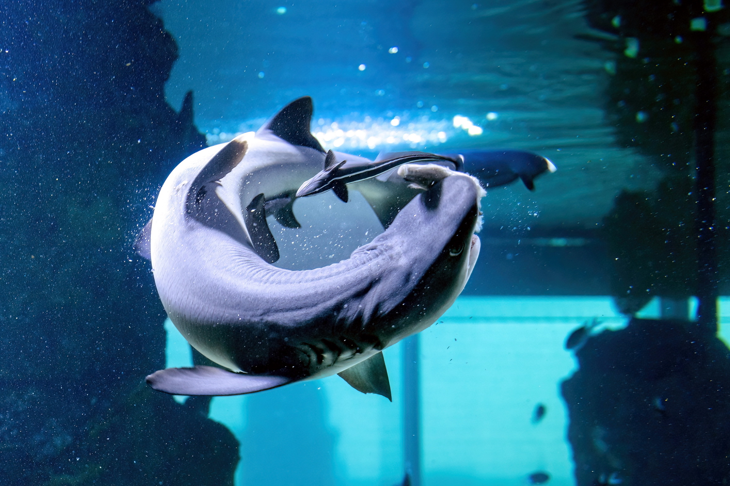 Im 360° Haiaquarium des Haus des Meeres gibt es seit Frühling einen neuen Bewohner. Ein sogenannter Schiffshalter-Fisch hat sich einen Weißspitzen-Riffhai als persönliche Mitfahrgelegenheit ausgesucht.