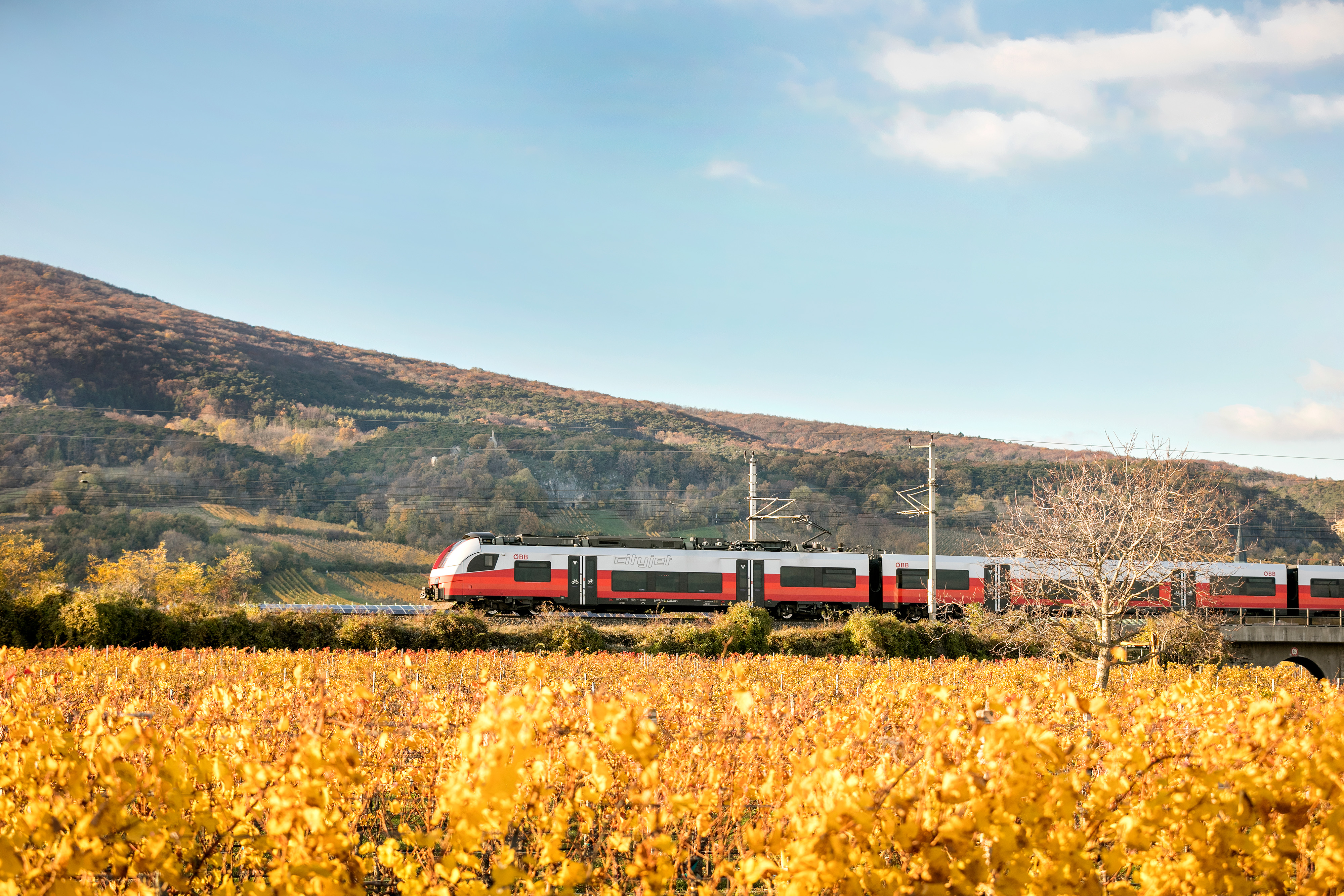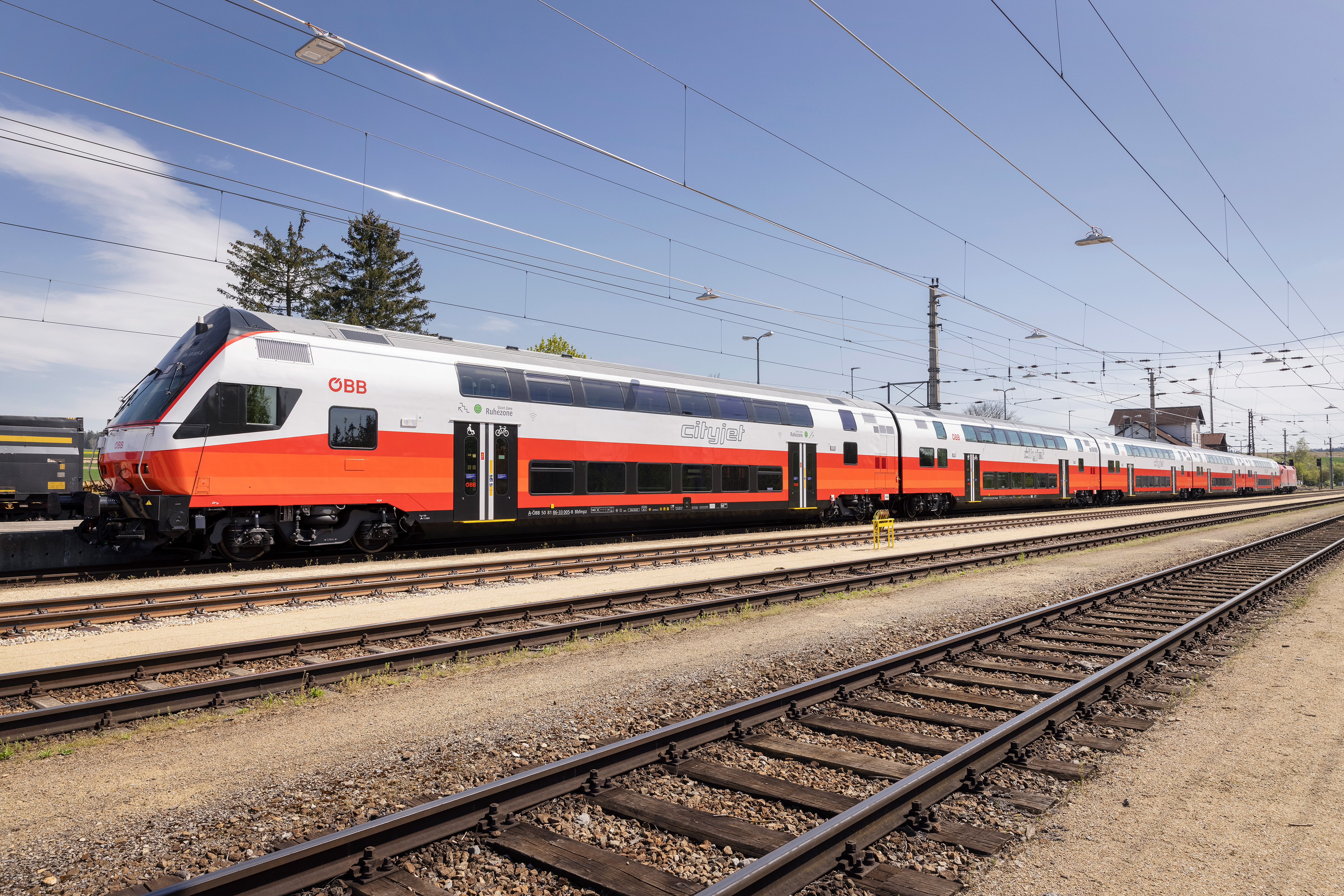 Mit seiner aerodynamischen Front durchschneidet der ÖBB Cityjet Desiro ML die Luft wie ein Pfeil in Rot-Weiß-Rot. Mit niedrigen Einstiegen, offenen Übergängen, großen Servicezonen und starken Farbkontrasten für bessere Sichtbarkeit fühlen sich Reisende mit eingeschränkter Mobilität genauso wohl wie Familien mit Kinderwagen und Fahrgäste mit Fahrrädern.
