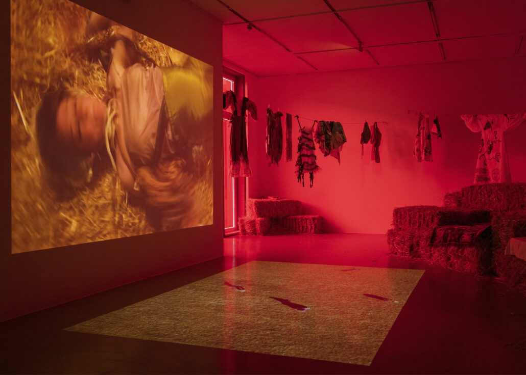 The Institute of Queer Ecology, Hysteria, 2023, Ausstellungsansicht, Kestner Gesellschaft, Foto: Volker Crone; Zheng Mahler, Lonely Vectors, TheGreenCrab; Tue Greenfort, Criewener No. 104, 2022. Courtesy the artist and König Galerie, photo: Tue Greenfort; Margot Pilz