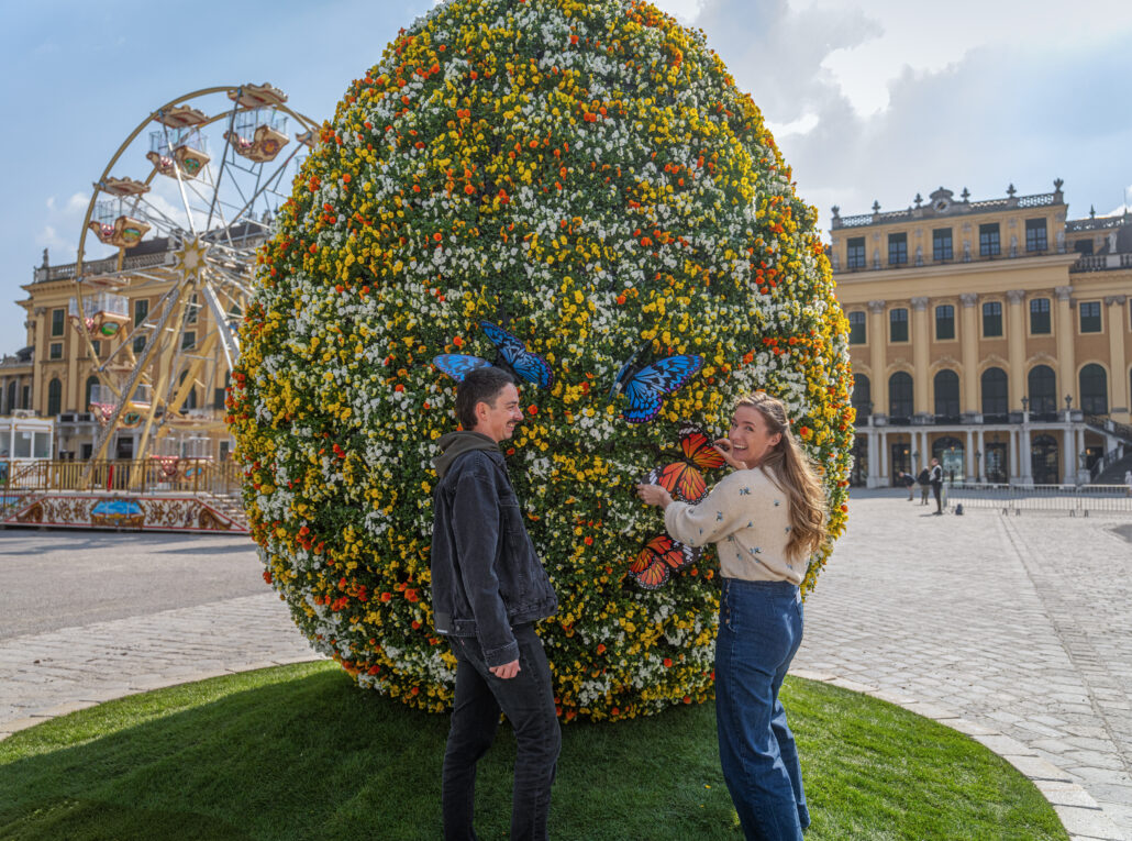 Besucher*innen des Ostermarkt Schönbrunn ein besonderes Highlight: Österreichs größtes florales Osterei! Mit stolzen 4,20 Metern Höhe ist der gigantische Eierberg nicht nur das größte in Österreich, sondern kam sogar dem Weltrekord erstaunlich nahe. Ein wahrer floraler Koloss, den man unbedingt persönlich gesehen haben muss. Der Oster-Riese kann noch bis zum 19. April täglich von 10:00 bis 19:00 Uhr am Schloss Schönbrunn bewundert werden.
