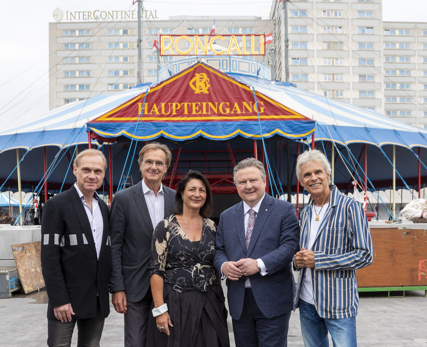 Mit dabei beim symbolträchtigen Zeltaufbau: Bürgermeister Michael Ludwig, Kulturstadträtin Veronica Kaup-Hasler, Intendant Roland Geyer, Erfolgsautor Thomas Brezina, Komponist Johnny Bertl sowie Patrick Philadelphia, Geschäftsführer des Circus-Theater Roncalli.