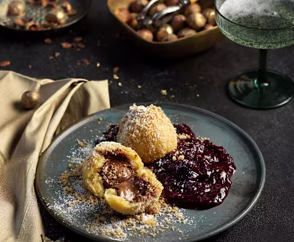 Nougatknödel mit Nussbröseln und Zwetschkenröster (vegan)