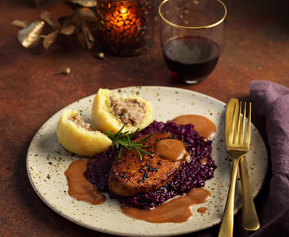 Vegane Entenbrust mit Maroniknödeln und Apfelrotkraut (vegan)