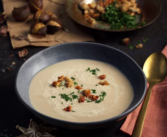 Samtig, nussig und perfekt für kalte Winterabende: Eine Maronicremesuppe ist der ideale Start in ein festliches Menü. Dank Thermomix und Cookidoo ist sie in wenigen Handgriffen vorbereitet – zehn Minuten aktiv, insgesamt 45 Minuten bis zum Servieren. Ergibt sechs Portionen und sorgt für einen stilvollen Einstieg ohne Stress.