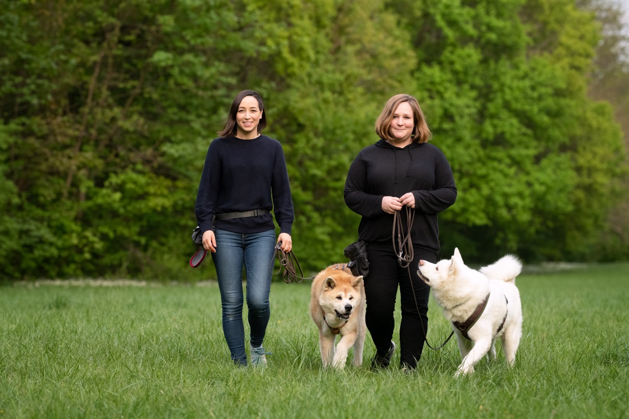 Beitragsbild: Die Hundetrainerinnen Viola und Kerstin von Darwin Dogs zeigen, dass sowohl das ruhige Vorbeigehen als auch kontrollierter Kontakt an der Leine erlernbar sind. © Sandra Schmid Fotografie